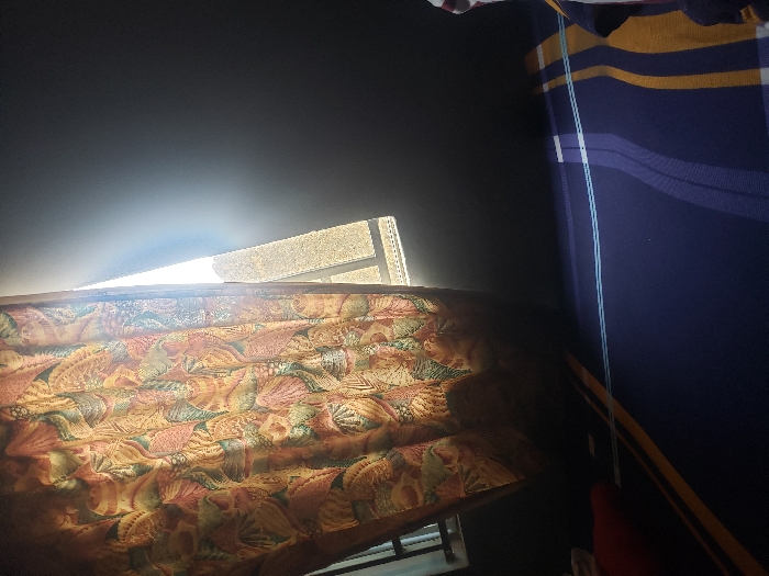The scene depicts an interior room in Sabon Tasha, Nigeria. On the left, a patterned curtain, featuring orange, brown, and green hues with a shell or leaf motif, partially covers a window. Bright sunlight penetrates a vertical gap between the curtain and the right side of the window frame, illuminating a light-colored exterior surface, possibly a wall or ground. The interior walls appear dark due to the contrast with the intense sunlight. The lower right portion of the frame shows a blue surface, likely a mattress or bed, adorned with horizontal stripes in light blue, dark blue, and yellow/orange. A small, reddish object is visible on a dark surface in the lower-left corner. A fragment of striped fabric is visible on the far right edge of the blue surface. No individuals or active interactions are present.