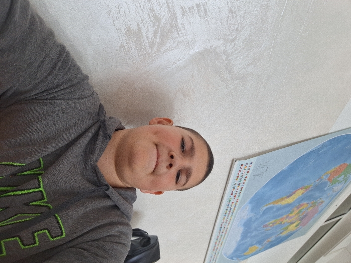 The scene is an indoor environment located in the city of Pernik, Bulgaria. A young male subject is depicted in a frontal, slightly low-angle close-up. He has a short, buzzed haircut and wears a grey hooded sweatshirt with a green outline "NIKE" logo on the chest. His facial expression is neutral, with a slight upturn at the corners of the mouth and visible dimples on his cheeks, and he is looking directly at the camera. The background features a light-colored wall with a textured, irregular finish. Mounted on the wall above the subject's right shoulder is a colorful political world map poster, depicting continents in various hues, with discernible text along its lower edge. A dark object, consistent with a backpack or bag, is partially visible in the upper right corner of the frame, behind the subject's left shoulder.