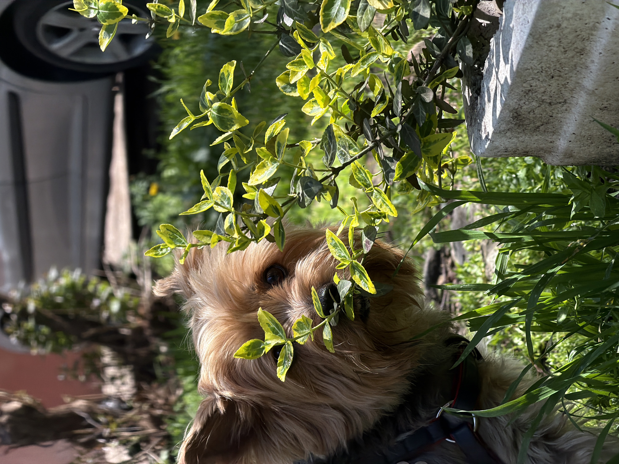- "A medium, close-up shot shows a brown Yorkshire Terrier dog partially obscured by foliage, likely in a garden or park setting" by FM-MFgjC3, licensed under CC BY 4.0