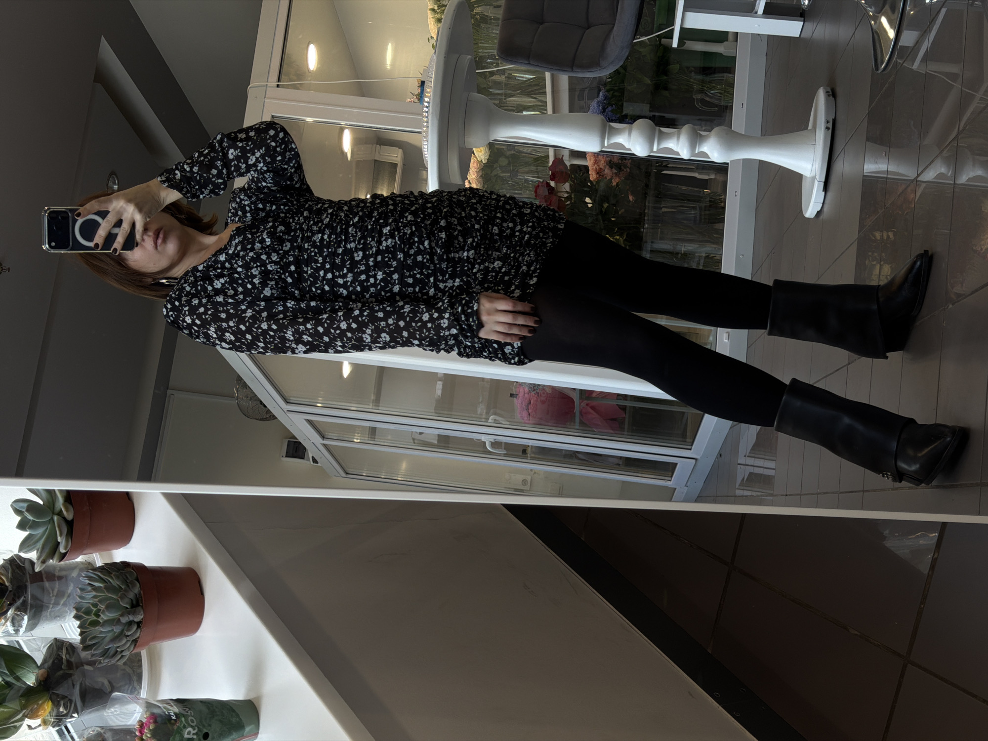 A woman is taking a selfie in a store. She is wearing a short black dress with white floral print, black tights, and black boots. The reflection shows a plant shelf with succulents and cacti, a white table with a chair, and part of the store’s window. The location appears to be Ust-Ilimsk, Russia, based on the image's origin.