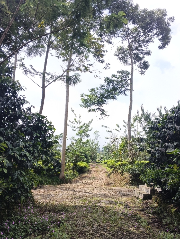 The image depicts an unpaved, winding dirt path through a verdant, overgrown area in what is identified as the city of Nanlao, China. The path, illuminated by bright daylight, recedes into the distance, bordered on both sides by dense, dark green foliage and various shrubs. On the immediate left foreground, thick, broad-leafed plants, possibly coffee, are prominent, with small patches of pinkish-purple flowers near the ground. Several tall, slender trees with light-colored trunks and green canopies dominate the upper portion of the frame, framing the path and extending towards a bright, partially cloudy sky. In the middle ground on the right side of the path, a small, multi-tiered concrete structure, possibly steps or a low platform, is visible embedded in the embankment. No individuals or animals are present. The background shows hazy green hills or distant tree lines beneath the sky.