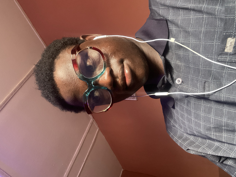 A young dark-complexioned male is depicted in a close-up, chest-up shot indoors in Mosafejaw, Nigeria. He has short, dark, kinky hair and a neutral expression, looking directly at the viewer. He wears large, thick-framed eyeglasses, primarily teal on the lower half and reddish-brown on the upper half, with gold accents at the temples. White wired earphones are in his ears, with the wire extending down over his chest. He is dressed in a dark blue polo shirt with a fine white grid pattern. The background consists of a plain reddish-brown wall, with a segment of a white ceiling featuring two parallel moldings visible in the upper left portion of the frame. Lighting appears artificial, casting a subtle purplish hue near the ceiling in the top left.