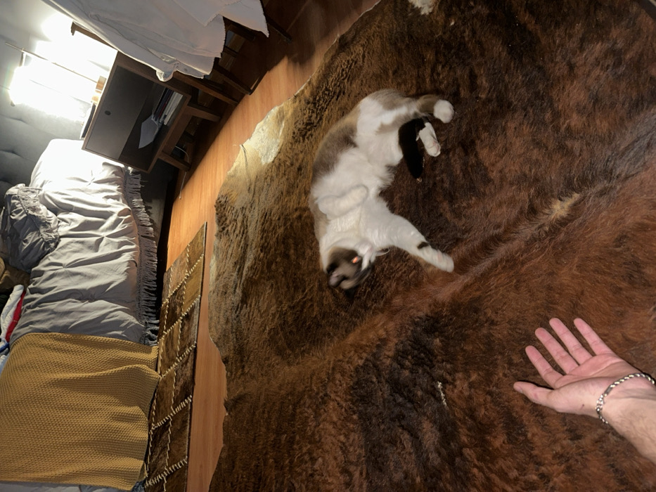 room setting with a bed covered in gray linens and a yellow blanket to the left. A wooden dresser stands beside the bed. On the floor, a brown and tan patterned animal hide rug dominates the scene, featuring a cat lying upside down, its white belly exposed. A human hand extends onto the rug from the lower right corner, adorned with a silver bracelet. The image is shot from a slightly elevated angle, providing a wide view of the indoor space.