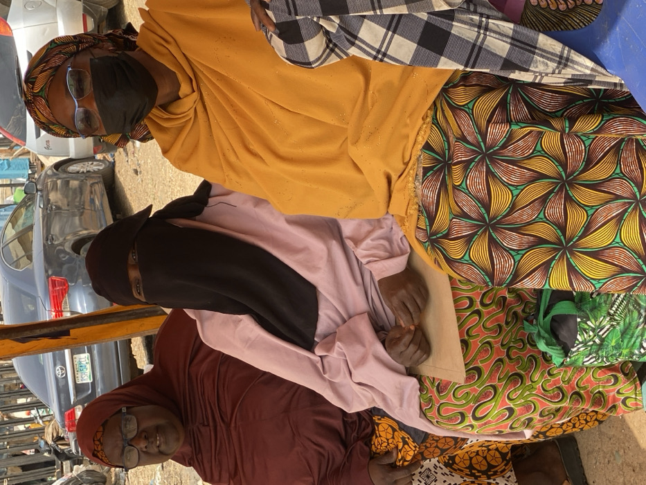 The image depicts three adult females seated outdoors in Kawo, Nigeria, on a dusty, unpaved surface