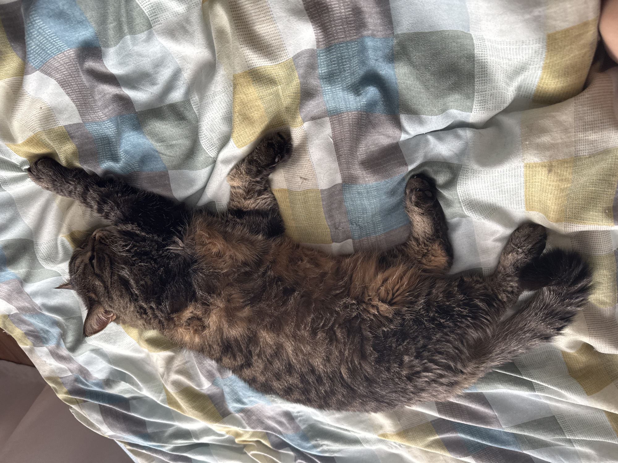 This image depicts a domestic cat asleep on a bed in Perm, Russia