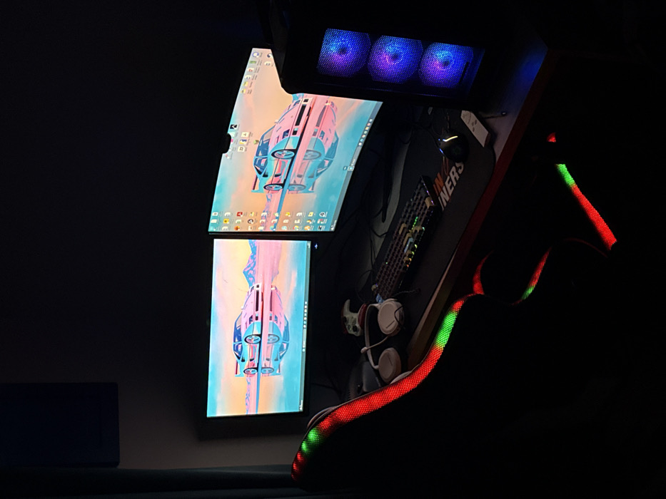 The scene depicts a dimly lit gaming setup within a room in Varna, Bulgaria. Two illuminated computer monitors are prominently displayed on a desk, each displaying a identical digital wallpaper featuring a stylized light-blue sports car reflected on a pink and blue futuristic landscape under a similarly colored sky. The left monitor is flat, while the right monitor exhibits a curved screen. To the right of the curved monitor, a black desktop computer tower stands vertically, its three front-mounted fans glowing with purple and blue LED lights. In the foreground, a black gaming chair with integrated red and green LED lighting along its edges is angled towards the desk, indicating an unoccupied position. On the dark-colored desk surface, a black gaming keyboard with illuminated keys rests on a black mousepad featuring white text, "INNERS". Adjacent to the keyboard, a black gaming mouse with a yellow scroll wheel and illuminated accents is visible. A pair of white over-ear headphones is placed to the left of the keyboard, near a white gaming controller. A small white remote control lies on the desk to the right of the mouse. The immediate environment is dark, with a faint light-colored curtain partially visible on the far left. No individuals are present in the image, and no active interactions are occurring.
