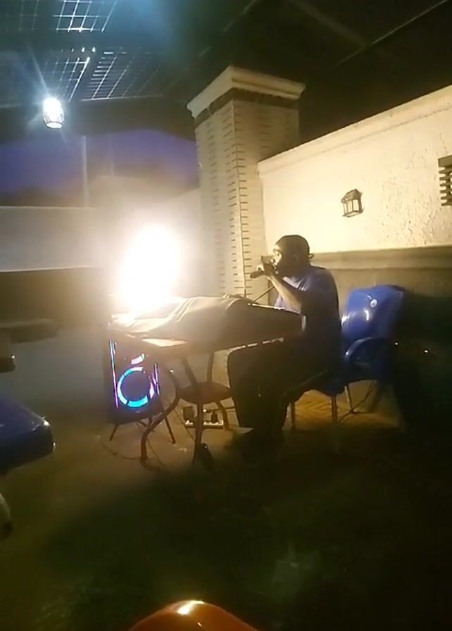 A person in a blue shirt and dark pants is sitting on a chair and singing into a microphone at a table under a covered outdoor area at night