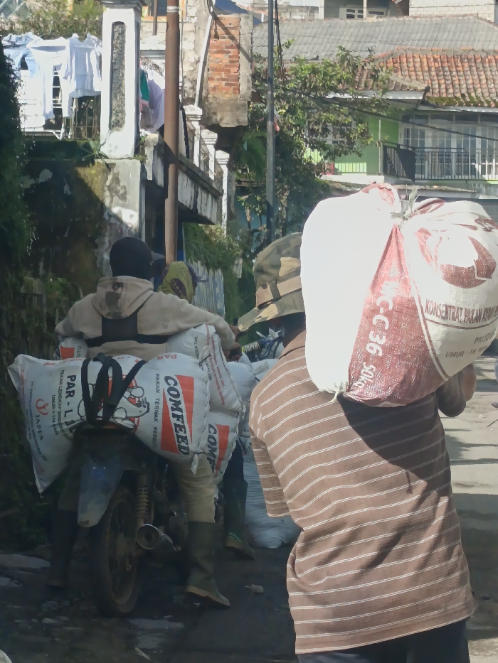 A street scene depicts a man in a brown striped shirt carrying a large sack on his shoulder labeled "KONSENTRAT PALAN AN" and "C-C 36-50kg". Further ahead, a motorcycle loaded with multiple white bags is visible. The bags have "COMFEED" and "PAR-L" printed on them, indicating livestock feed. The rider is wearing a hoodie and the passenger a headscarf. Buildings line the street, with clothes drying on a rack in the background.