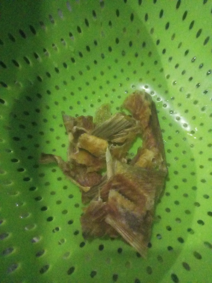 - "Dried fish parts sit inside a green plastic colander with small holes" by FM-UMKEv1, licensed under CC BY 4.0