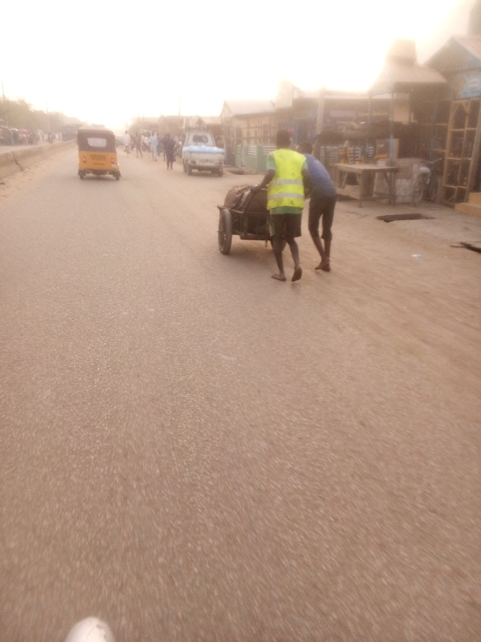 A road scene shows two men pushing a cart filled with goods