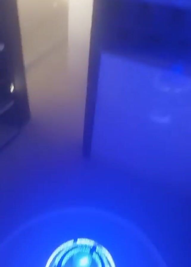 brightly lit room with blue lighting. The camera pans up to reveal a modern chandelier with concentric rings of light and a central orb. The room contains furniture, including a table, chairs, and a mirror. In the mirror's reflection, a person is visible. The overall environment appears stylish and contemporary.