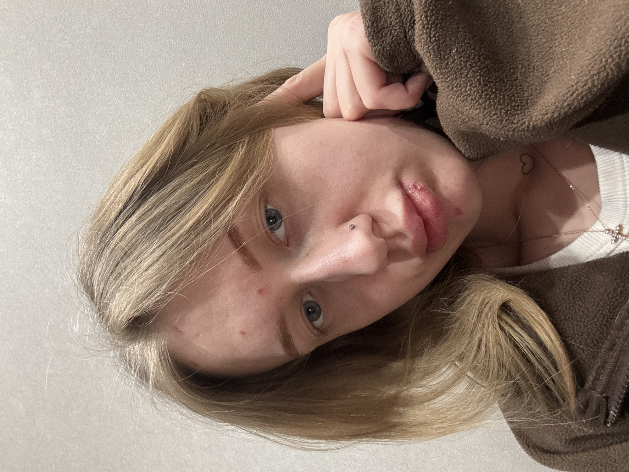 - "A portrait-oriented image displays a light-skinned individual with blonde hair and blue eyes, positioned against a plain, light grey, textured wall" by FM-89o1I3, licensed under CC BY 4.0