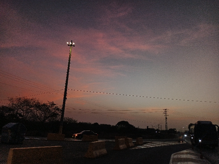 An outdoor dusk scene shows a partly cloudy pink and gray sky over a dark landscape. A tall light pole stands prominently to the left. Power lines traverse the frame horizontally. Silhouetted trees and other utility poles appear in the distance. In the foreground, concrete barriers line a road, with vehicles and a trash can visible. The overall mood is somber and quiet.