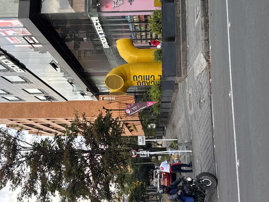street scene with buildings and street art. A large yellow sculpture resembling ventilation ducts sits outside a modern building. A motorcycle is parked on the street, next to two men dressed in white shirts with red trim. A sign indicating a closed street is visible, along with a parking sign. A large tree is in the foreground of the image.