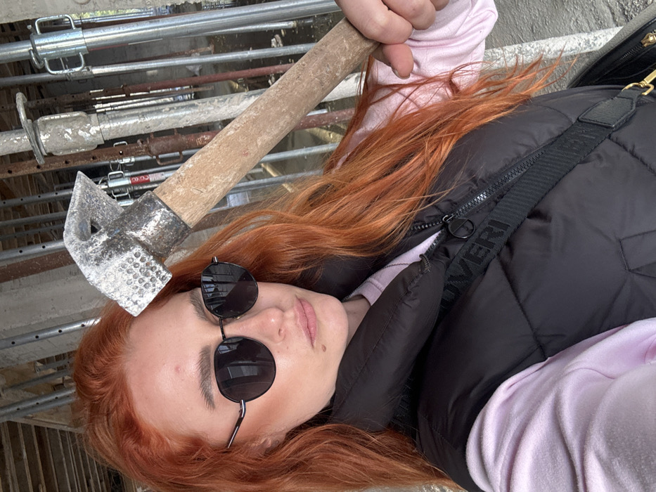The image displays a female subject at an active construction site in Kavač, Montenegro. The subject has long, wavy reddish-orange hair and wears dark, octagonal-framed sunglasses. Her attire consists of a light pink long-sleeved top beneath a black puffer vest. A black strap with "DISCOVERI" text is visible across her chest. She holds a brick hammer with a textured metal head and a worn wooden handle in her right hand, positioning it diagonally across her body with the hammerhead near her upper left face. The background features numerous vertical metal adjustable support props, consistent with formwork or scaffolding within an unfinished concrete structure.