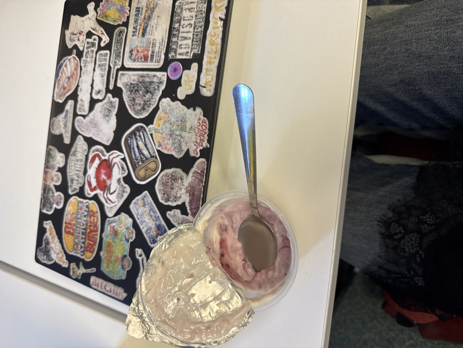 This image depicts an indoor scene within the city of Hull, United Kingdom. The primary focus is a partially consumed transparent plastic pot of yogurt, containing a white and reddish-purple swirled substance, suggestive of fruit yogurt. A silver-colored spoon is inserted into the yogurt. The foil lid of the pot is peeled back and partially crumpled. To the right of the yogurt pot, a black laptop or tablet device with its screen facing away from the viewer is visible. The exterior lid of this device is extensively covered with various stickers, including "BIG KAHUNA BURGER," "VANS OFF THE WALL," a red crab, a can of sardines, a blue Scooby-Doo Mystery Machine van, and a "HAWAII" identification card. The surface around the stickers appears to have some accumulated dust or debris. Both the yogurt pot and the laptop are resting on a clean, flat, white table or desk surface. Below the table, the upper portion of a person's legs, clad in blue denim jeans, is visible, with a section of dark lace material on the left thigh area. The lighting is uniform, suggesting an interior setting like an office, library, or cafe.