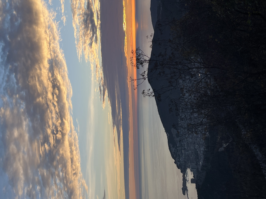 An orange sunset paints the sky, with textured clouds catching the light. A body of water reflects the sky's hues, transitioning to a darker shoreline dotted with buildings. A silhouetted mountain rises along the water's edge, partially obscuring the view with a dark, leafless tree in the foreground. The overall scene conveys a peaceful, scenic landscape.