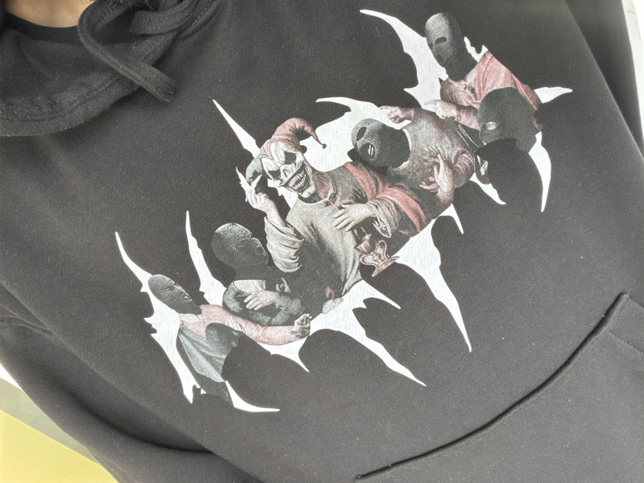 This image displays a black hooded sweatshirt featuring a detailed graphic print. The print depicts a central, pale-faced clown character with a wide, sinister grin revealing pointed teeth, wearing a jester's hat and a garment with red accents. The clown holds a small, white, jagged object in its left hand and has its right hand raised. Surrounding the clown are multiple figures, each obscured by a black balaclava, revealing only eyeholes. These figures wear long-sleeved clothing, some with visible reddish undergarments. They are portrayed in various dynamic poses: one figure in the upper left section appears to be emerging, another to the left of the clown has both hands raised to its head, a figure below the clown points its right index finger upwards, and another near the bottom right has intertwined hands. All these characters are depicted within or emerging from white, jagged, torn-fabric-like openings in the black fabric of the hoodie. A portion of the hoodie's front pocket is visible at the lower left, and part of the hood with drawstrings is at the upper right. The item rests against a blurred background showing shades of yellow and green, consistent with an indoor environment. This scene is located in the city of Sliven, Bulgaria.