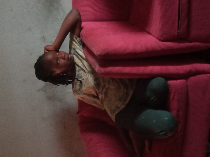 A young female individual is depicted seated on a fuchsia-colored upholstered sofa in an indoor setting in Sabon Tasha, Nigeria