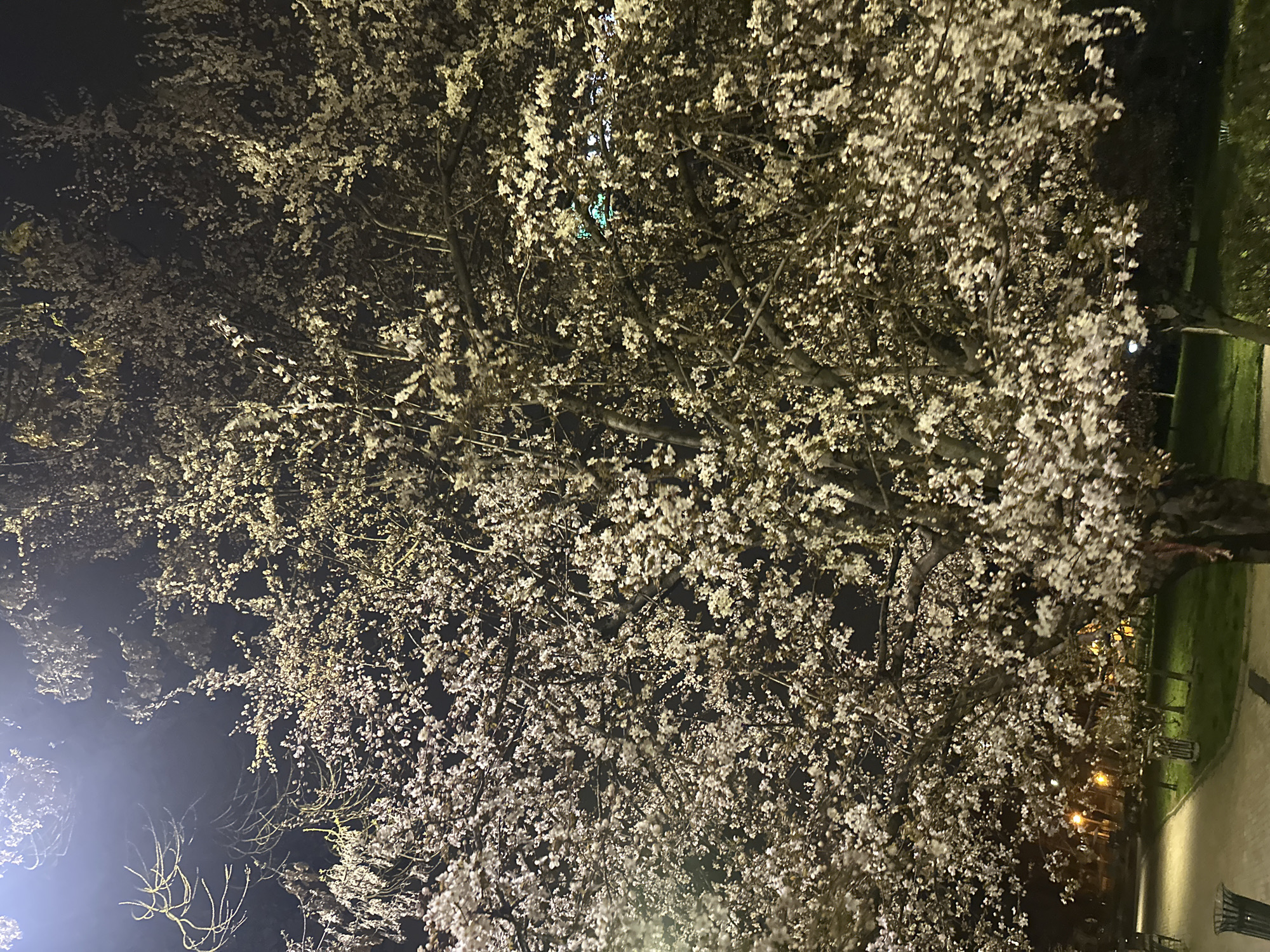 A low-angle shot shows a flowering tree at night, possibly in Sofia, Bulgaria. The tree's branches are laden with white blossoms illuminated by streetlights, contrasting with the dark sky. The backdrop includes glimpses of green vegetation and paved surfaces suggestive of a park or garden setting. The scene appears tranquil and illuminated.