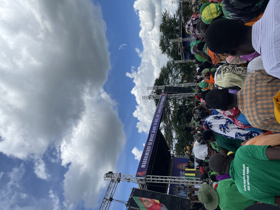 A large crowd of people gather in front of a stage in Bariadi, Tanzania (latitude: -2