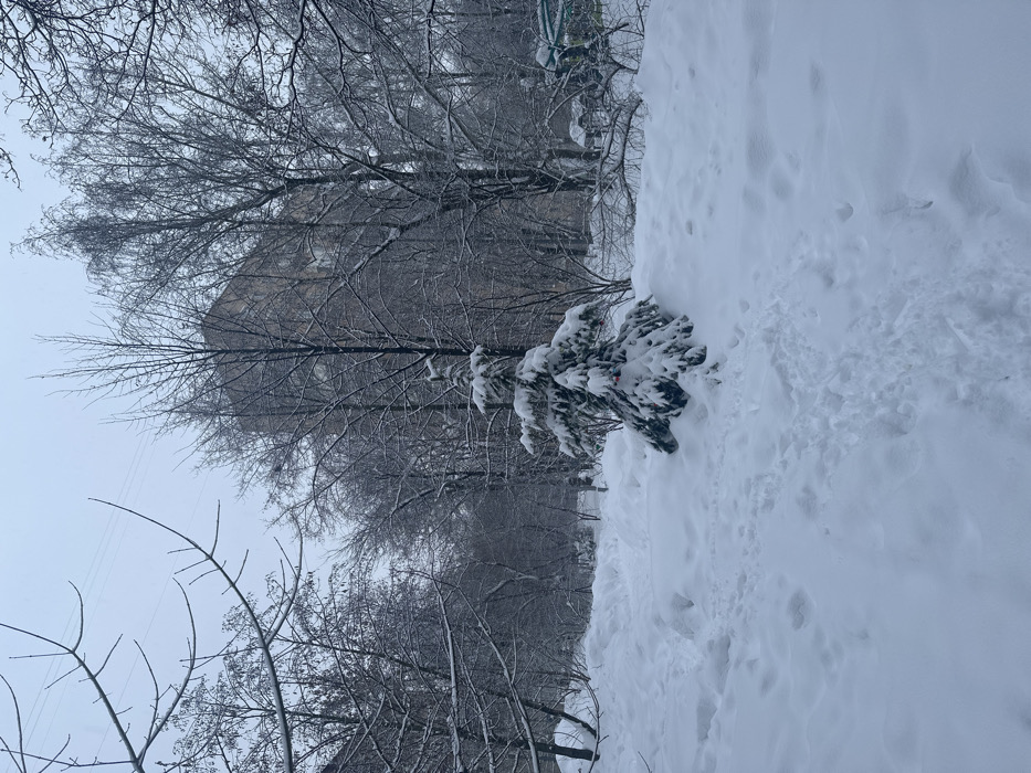 A snow-covered landscape features a small, snow-laden coniferous tree on the right, surrounded by deep drifts. Bare, leafless trees fill the background, their branches laced with snow. In the distance, a building is partially visible through the skeletal trees. The scene conveys a sense of winter's stillness and quietude under a heavy blanket of snow.