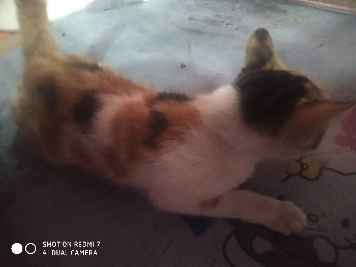 - "The image displays a calico cat resting on a patterned fabric surface indoors, located in Cipinang, Indonesia" by FM-kh49F3, licensed under CC BY 4.0