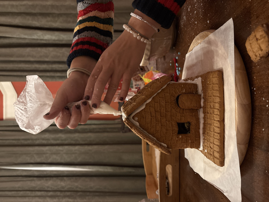 A person is decorating a gingerbread house with white frosting from a plastic piping bag. The house is on a wooden platter covered with parchment paper. A bite-sized piece of gingerbread sits nearby. The person's wrists are adorned with bracelets and they are wearing a multicolored sweater. The background features a curtain. The photo appears to be taken indoors.