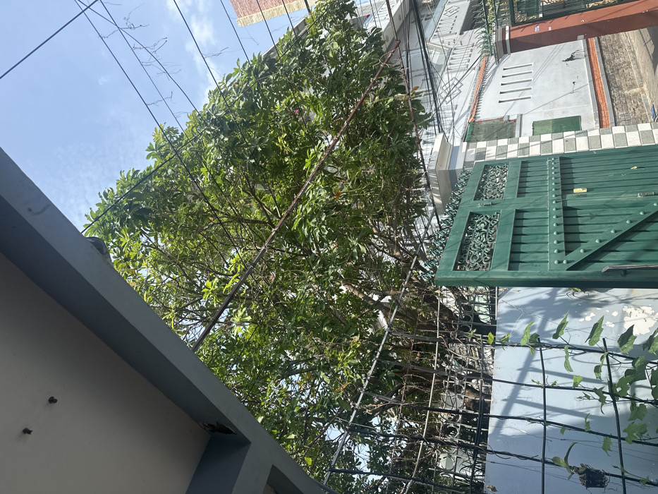 leafy, green tree in the foreground, viewed from underneath, with a green metal gate on the left side. The tree appears to be blocking the view of the house behind it, which is partially visible. The house has a light blue wall with a red brick trim. The roof of the house is obscured by the tree. The wall of the house has multiple windows, but the glass is obscured by the tree. The tree has dark, tangled branches, and there are many brown power lines overhead, which extend across the scene. The scene is taken from a street in Vũng Tàu, Vietnam, located at the coordinates 10.355° N, 107.091° E. The sky is blue with some white clouds visible. The image was likely taken on a sunny day.