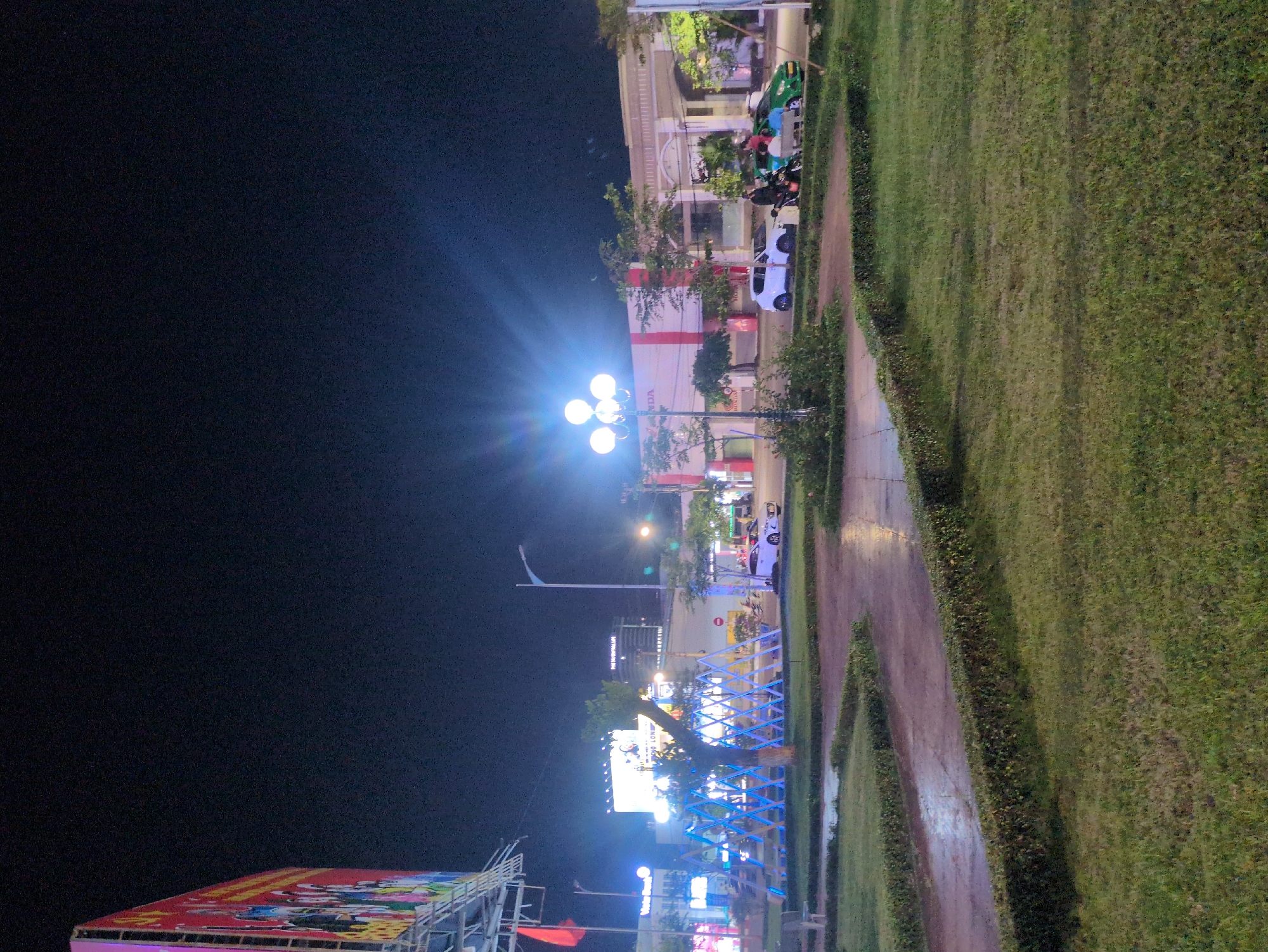 At night, the South Quy Nhon Ward, Vietnam, features a sidewalk path with green grass. A light post illuminates the area, while cars and scooters are parked nearby. Buildings with signage are in the background. A blue, lighted installation is visible. A distant sign is atop a structure.