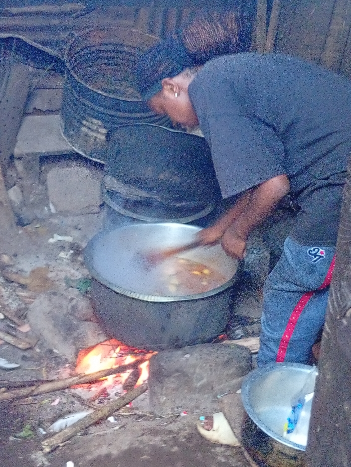 In Nyeri, Kenya, an individual is observed in a rudimentary outdoor or sheltered cooking area