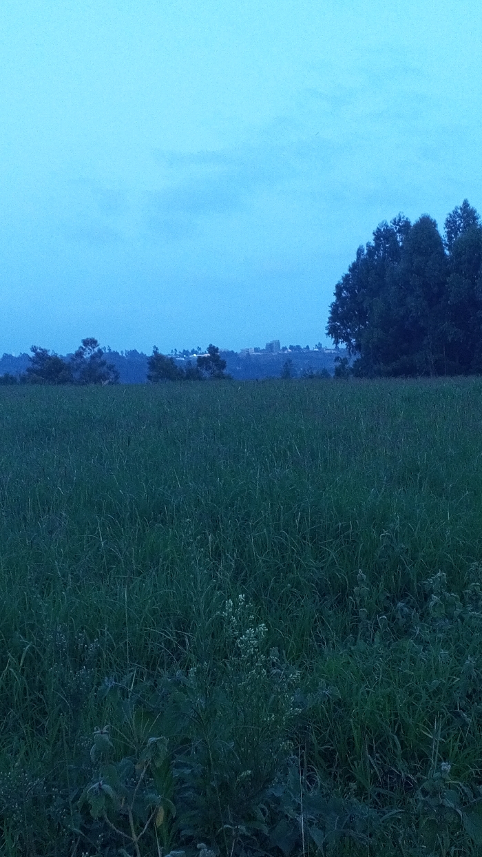 The image depicts an outdoor landscape in the city of Ndeiya, Kenya, under low light conditions. The foreground, occupying approximately two-thirds of the frame, is dominated by a dense field of tall, dark green grass and various weeds. Several lighter-colored herbaceous plants are discernible within the dense vegetation, particularly in the lower center. The sky, a uniform light blue, occupies the upper third of the frame, indicating an overcast condition or a twilight hour. A distant treeline of dark green foliage stretches horizontally across the midground, with a more substantial cluster of trees visible on the right side. Beyond this treeline, on the far horizon, a cluster of indistinct, dark-toned buildings or structures is visible, suggesting a distant developed area. No individuals, animals, or specific actions are observed.