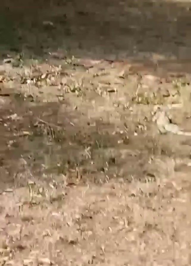 lizard on dry dirt and sparse greenery. The lizard is medium-sized, with a long tail and mottled grey and green coloring. It moves slowly and adjusts its position on the ground. The background is a mixture of bare dirt, dead leaves, and a few small plants. The lighting is dappled, suggesting the scene is partially shaded.