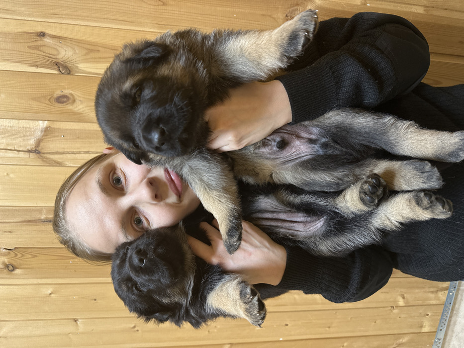 - "A fair-skinned person in a black sweater is holding three German Shepherd puppies" by FM-CYKiS2, licensed under CC BY 4.0