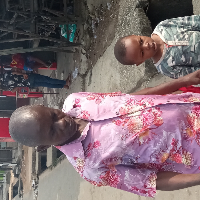 The scene depicts an outdoor urban environment in Umuode, Nigeria, under bright daylight conditions. In the foreground, an adult male and a young child are walking. The adult male, with a dark complexion and balding head, wears a short-sleeved, collared shirt featuring a pink background with prominent red and cream floral patterns. His gaze is directed downwards and slightly forward. To his right and slightly behind him is a young child, approximately 2-4 years old, with dark skin and short dark hair. The child wears a long-sleeved camouflage-patterned Henley shirt in shades of green, grey, and beige, with a few red buttons. The child's mouth is slightly open, and their gaze is directed forward. The ground consists of uneven concrete paving and exposed dirt, with visible open drainage channels or gutters running alongside the path. In the mid-ground and background, several other individuals are present. One male in a dark, short-sleeved patterned shirt and blue jeans stands near two red, rectangular structures, possibly kiosks or vending machines, one of which has a small brown box on top. Further to the right, a wooden structure resembling a market stall or scaffold is partially visible, with discarded items or debris beneath it. Another individual in a red top is seated behind this structure. General urban debris and loose materials are scattered across the ground in the background.