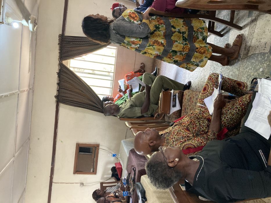 The image depicts an indoor gathering of multiple adults within a room located in Umuahia, Nigeria