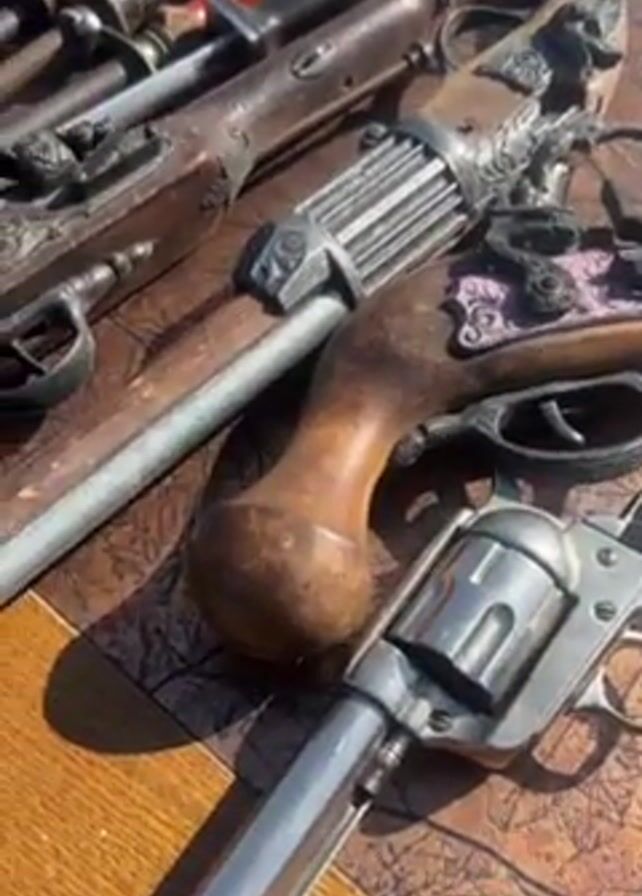 A close-up shot shows several toy guns and knives displayed on a patterned table