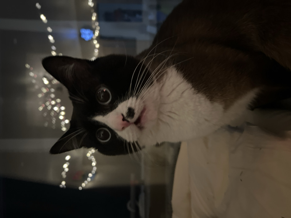 A black and white cat stares intently at the camera with wide eyes. The cat's head is tilted to the left. The nose is pink with a black marking, and long white whiskers protrude. Christmas lights blur in the background. The cat's fur is mostly dark, with white markings around the face and chest.