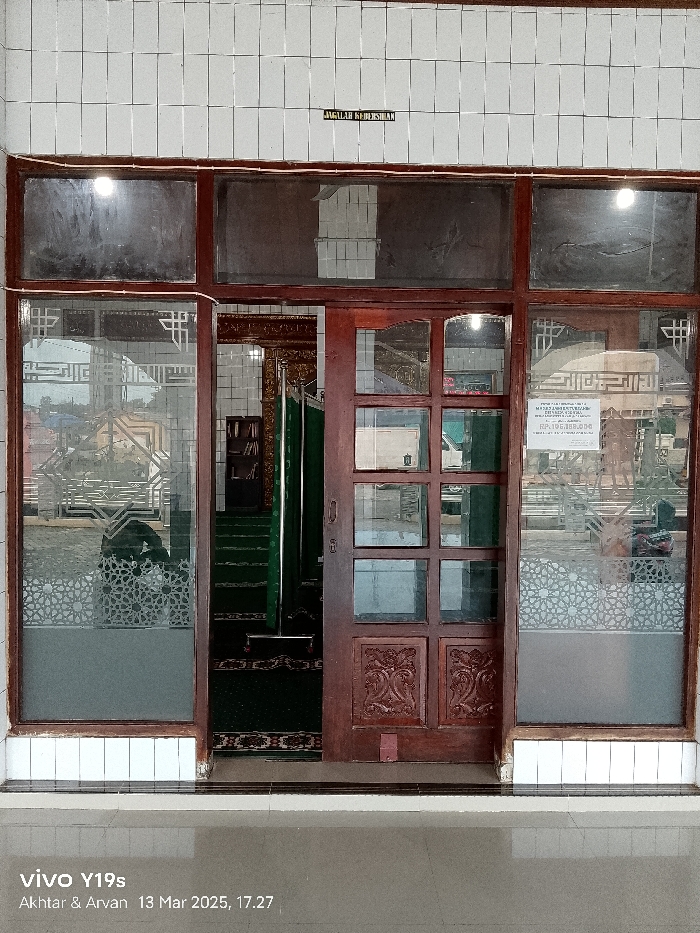 entrance to a building at the coordinates -6.44, 108.028 in the city of Kecamatan Gabuswetan, Indonesia. There are three glass doors, two of which are open. One door is closed and appears to be made of wood. A sign above the door reads "ANGGARAN KAS ISLAM". A green rug is visible inside, along with a wooden shelf with books on it. An IV stand is also visible inside the building. The floor outside the building is made of white tiles. The image was taken at 17:27 on March 13, 2023.
