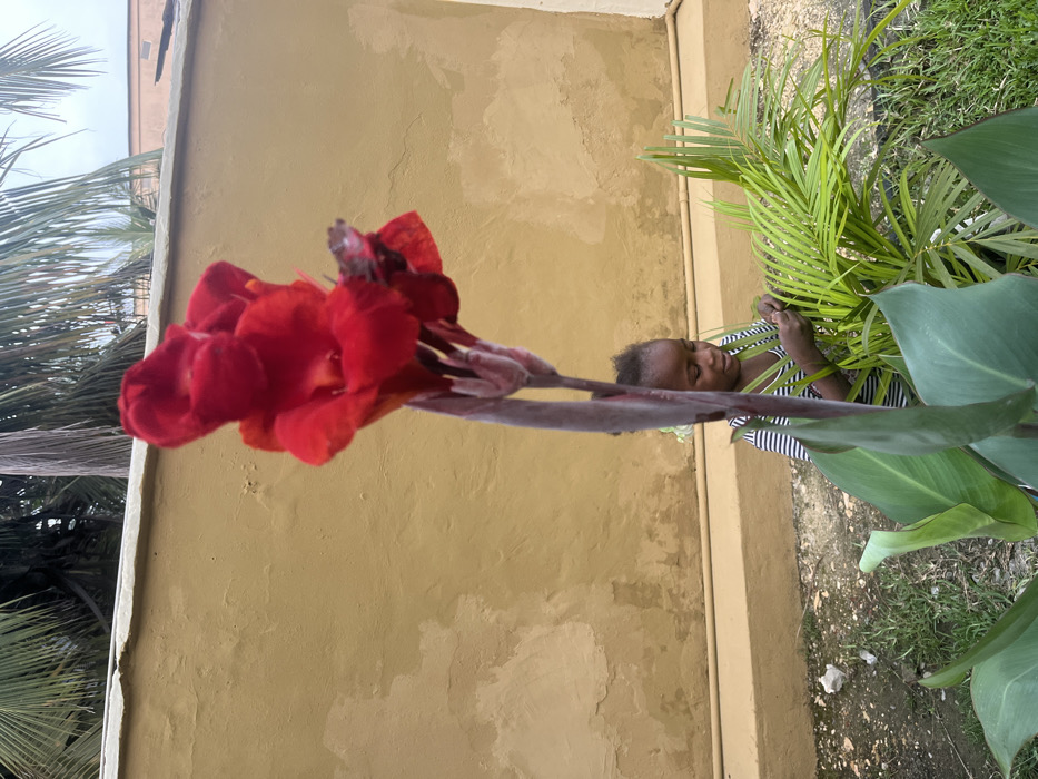 A vibrant red flower stalk stands prominently against a beige wall. Behind it, a young child in a striped shirt interacts with a lush green plant with feathery leaves. Large, broad leaves are also visible amidst the verdant foliage. The background includes glimpses of another palm tree and grass. The image has a slightly tilted perspective, capturing a moment of interaction between the child and the natural surroundings.