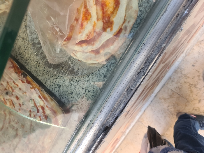 The image depicts an indoor scene within a food establishment in At-Tall, Syria, observed from a downward-angled perspective through a glass display case. Inside the display case, resting on a speckled grey countertop, a large, rectangular pizza with visible crust, red sauce, white cheese, and dark toppings is positioned on the left. To its right, a stack of smaller, round flatbreads or mini-pizzas topped with sauce and cheese is visible, enclosed within a transparent plastic bag and placed on a clear, round plate. The display case features a dark green upper frame, curved glass panes, and a lower metallic support bar situated above a reddish-brown patterned front panel. In the lower-left foreground, the lower legs and feet of an individual wearing blue jeans and dark shoes are partially visible, standing on a light-colored tiled floor with visible grout lines.