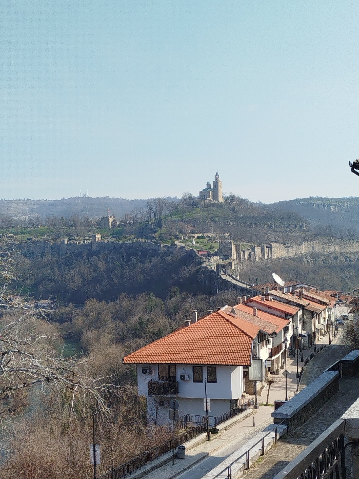 The image displays a panoramic daytime view of Veliko Tarnovo, Bulgaria