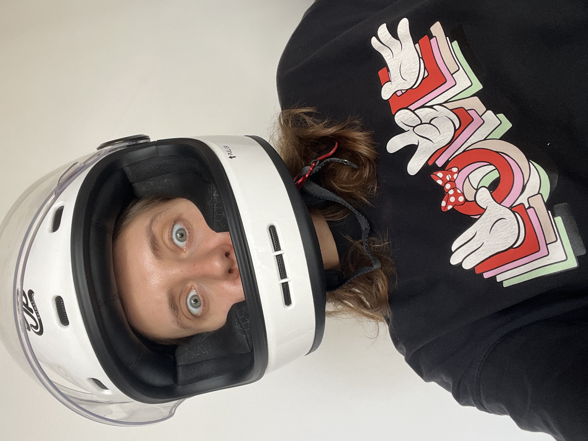 A rotated medium shot shows a person wearing a white helmet with a transparent visor, looking directly at the camera with wide eyes. The person is also wearing a black hooded sweatshirt with a "LOVE" graphic featuring Mickey Mouse hands and a red polka-dot bow. The background is a plain, light-colored wall. There is no visible evidence to indicate this photo was taken in Canggu, Indonesia.