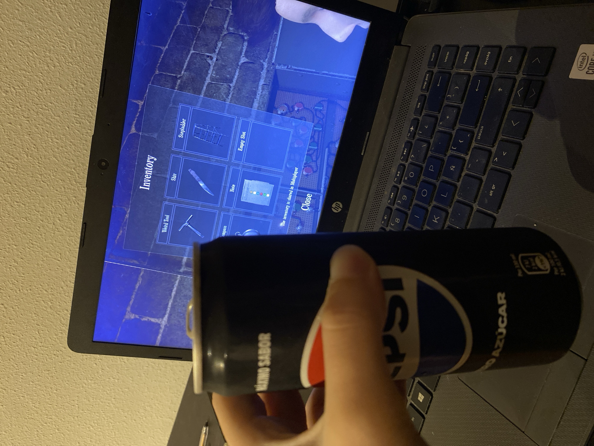 The scene depicts an indoor environment, identified as a location within Gijón/Xixón, Spain, observed from a slightly elevated perspective. A human right hand, with fingers curled around it, holds a dark blue/black Pepsi Zero Azúcar can. The can bears white text "MÁXIMO SABOR" and indicates 7 kJ / 2 kcal per 100 ml. The hand and can are positioned centrally in the foreground, partially obscuring the lower-left portion of an open HP laptop. The laptop, with a dark gray chassis, displays a video game interface on its screen, predominantly featuring a blue-toned "Inventory" menu. Visible inventory items include "Weird Tool" (depicting a pickaxe), "Shiv" (a knife), "Stepladder," "Compass," "Note" (a graphic of a document with colored circles), and an "Empty Slot." Text states, "The inventory is shared in Multiplayer," alongside a "Close" button. The game's background depicts a brick wall texture. The laptop's keyboard features a Spanish layout, identifiable by keys such as "Ñ," "INICIO," and "RE PÁG." An "Intel Core i5" sticker is visible on the lower-right palm rest. Both the keyboard and palm rest show visible dust accumulation. In the background, a light-colored, textured wall (likely beige or off-white) is visible. A dark, flat surface, presumably a desk or table, extends to the left of the laptop, with a pen or pencil resting upon it. The overall lighting is dim, with the laptop screen serving as a primary light source.