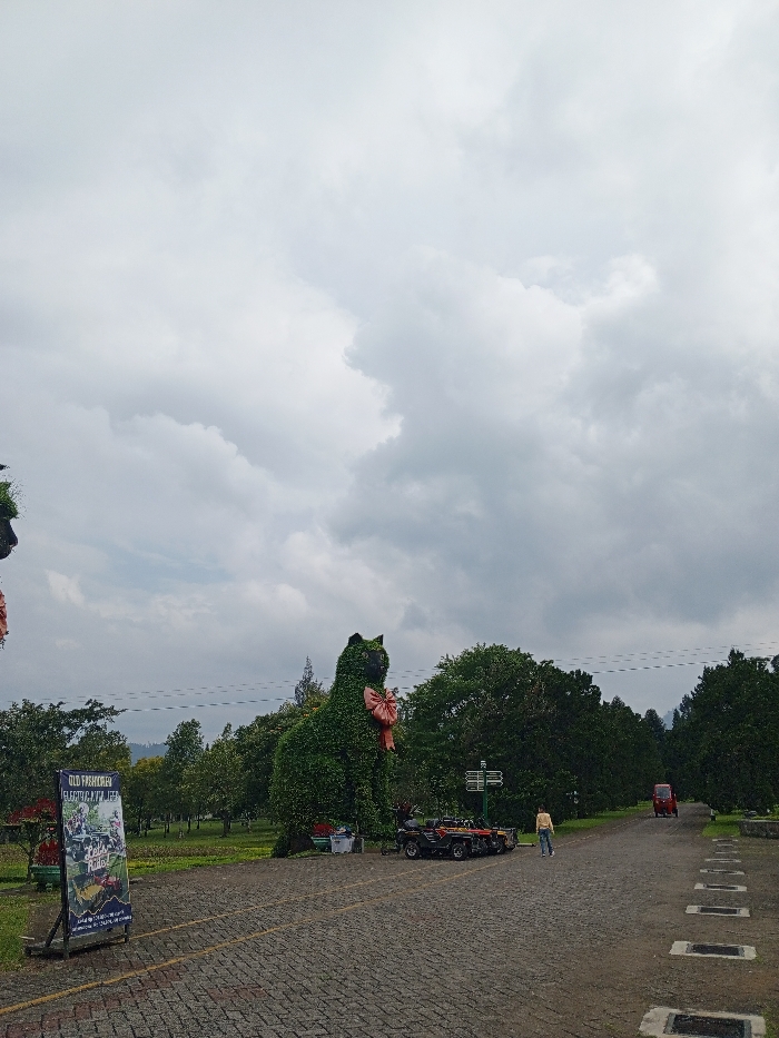A park features a large cat topiary with a pink bow. The scene is overcast, with heavy clouds filling the sky. A road paved with brick stretches through the park, leading to trees and a red car in the distance. An advertisement board and several parked ATVs are on the side of the road near the cat topiary. A person is walking on the road toward the car.
