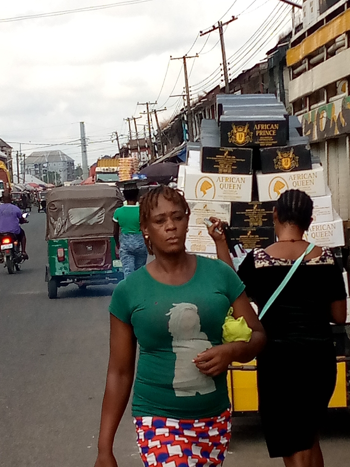 The image depicts a bustling street scene in the city of Aba, Nigeria, under an overcast sky