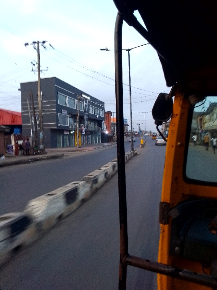 - "The image depicts a street scene in Lagos, Nigeria, captured from the interior perspective of a moving yellow three-wheeled motorized vehicle, likely a Keke Napep, evidenced by the yellow frame and side mirror visible on the right" by FM-NqVRd2, licensed under CC BY 4.0