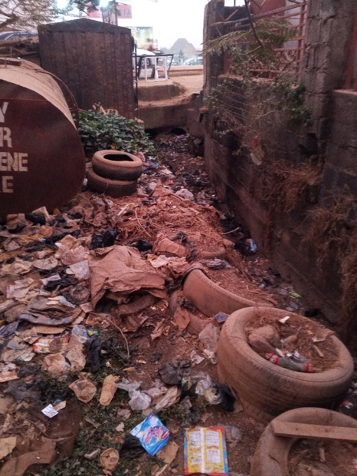 A heavily polluted alleyway overflows with garbage. Discarded tires and miscellaneous trash fill the scene. A rusted tank sits on the left, while a brick wall defines the right. A drain barely visible beneath the waste suggests inadequate sanitation. The image highlights environmental neglect and potential health hazards in the area.
