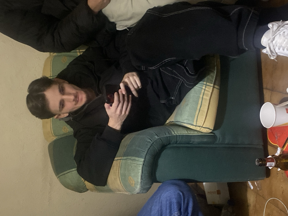 A young man reclines on a green patterned armchair, holding a small red object. He wears a black hooded sweatshirt and dark trousers. Others are partially visible: a person in a black jacket above him, another in blue jeans below. A white shoe, a paper cup, and a beer bottle rest on the floor near the chair. The room appears casual and somewhat cluttered.