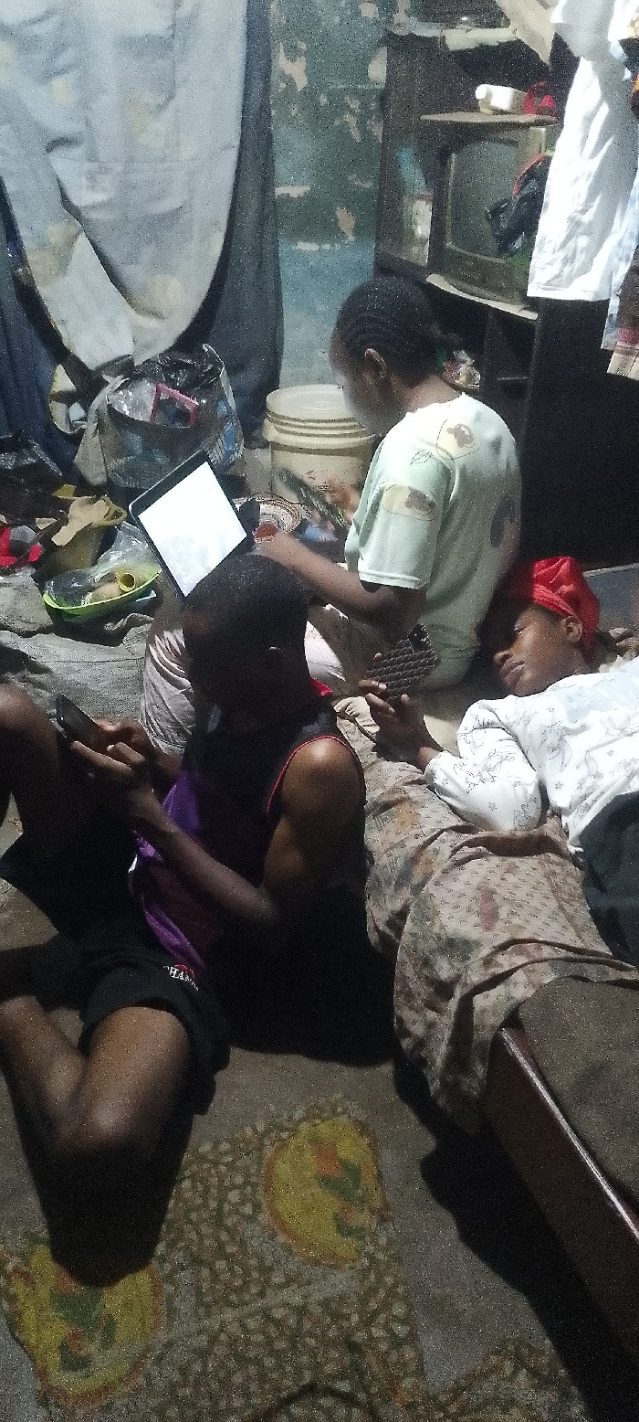 Four people are gathered on the floor of a dimly lit room. A boy holds a tablet over his head while looking at a phone in his hands. Next to him, a woman with a red headscarf is lying down. Another woman with short hair is sitting up and using a keyboard. The room is cluttered with belongings, including bags, containers, and clothes. A small TV sits on a shelf in the background.